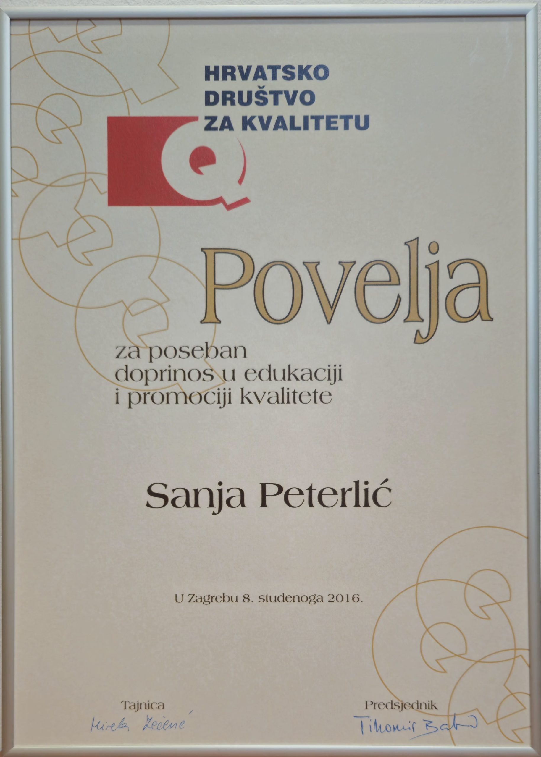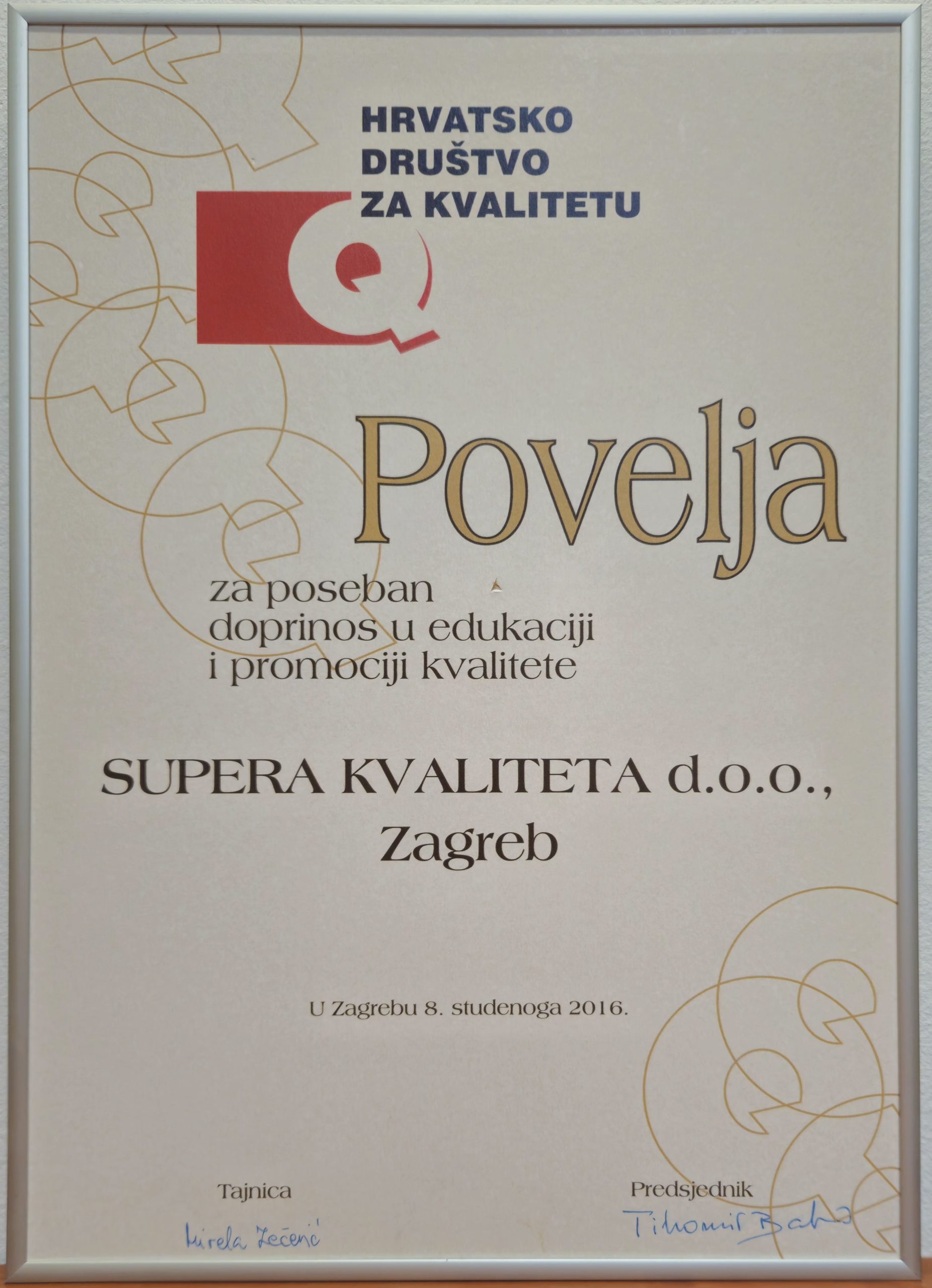 Hrvatsko društvo za kvalitetu (HDK) dodijelilo nam je 2016. godine “Povelju za poseban doprinos u edukaciji i promociji kvalitete” i to SUPERA KVALITETI u kategoriji “malo poduzeće” te “Povelju za poseban doprinos u edukaciji i promociji kvalitete” našoj direktorici Sanji Peterlić kao pojedincu.